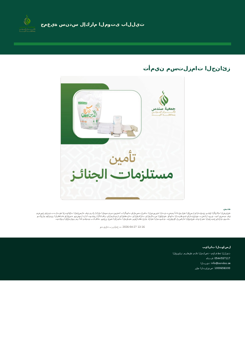 مشروع يعنى بتلبية احتياجات المغسلة في مركز إكرام الموتى وتزويدها بالأدوات والمستلزمات الضرورية التي تضمن أداء عملية الغسل والتجهيز وفق الأحكام الشرعية وبأعلى معايير النظافة والجودة. ويشمل ذلك توفير الأكفان، والمناديل، والمطهرات، والقفازات، والملابس الواقية، وأدوات التنظيف والتعقيم بشكل دوري، بما يسهم في تمكين العاملين من أداء مهامهم بكفاءة، ويعزز جودة الخدمات المقدمة، ويحافظ على كرامة المتوفى، تحقيقا لرسالة الجمعية في خدمة المجتمع وإكرام موتاه.